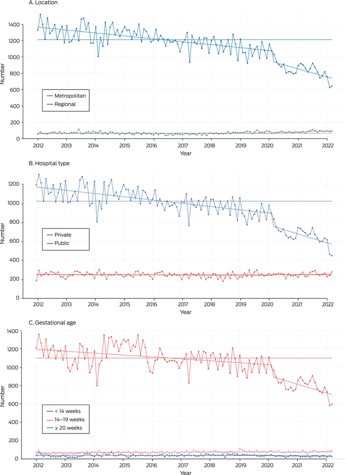 * Adjusted for autocorrelation and seasonality. For clarity, each time series is graphed separately in the Supporting Information, figures 1 and 2. Median pre‐pandemic values: A. metropolitan, 1209 (interquartile range [IQR], 1151–1311), regional, 65 (IQR, 58–76); B. private, 1024 (IQR, 964–1118), public, 252 (IQR, 236–268); C. < 14 weeks, 1096 (IQR, 1024–1194), 14–19 weeks, 70 (IQR, 61–76), 20 weeks or later, 35 (IQR, 28–42).