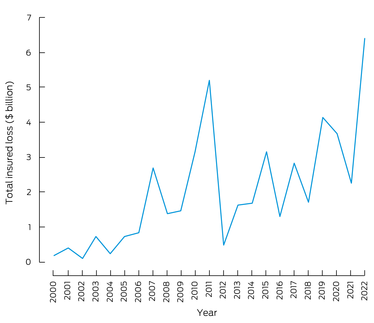 • Our results highlight the health and economic costs of inaction on health and climate change. A series of major flood events across the four eastern states of Australia in 2022 was the main contributor to insured losses from climate‐related catastrophes of $7.168 billion — the highest amount on record. The floods also directly caused 23 deaths and resulted in the displacement of tens of thousands of people.