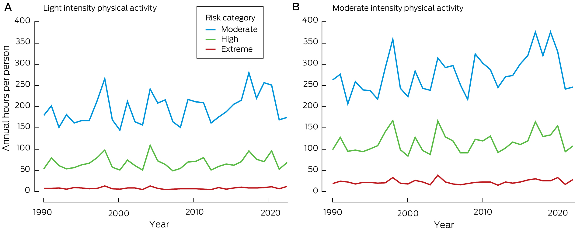 Physical and sporting activities are an important part of life in Australia. They can contribute significantly to both physical and mental health as well as strengthening communities and driving positive social change.21,22 This indicator follows the estimated heat stress risk of people participating in outdoor physical and sporting activities across Australia and in large cities within each state and territory. As detailed in the Sports Medicine Australia Extreme Heat Policy, moderate risk indicates that additional rest breaks should be undertaken. High risk requires the additional implementation of active cooling strategies (eg, water dousing), and extreme risk indicates that activities should be suspended.23 The policy splits sports into five risk classification groups according to the combined effects of exercise intensity and clothing/equipment worn.23 This indicator focuses on the first risk group “light intensity physical activity”, which includes leisurely walking, and the third risk group “moderate intensity physical activity”, which includes soccer, tennis, netball and similar sports and activities.