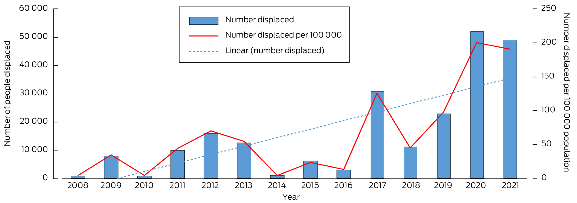 In 2021, 48 937 people were forcibly displaced by weather‐related disasters in Australia, including floods (n = 42 139), storms (n = 5569), and bushfires (n = 1229).46 There is an upward trajectory in weather‐related displacement, even adjusting for population increase (Box 7). With more frequent and intense extreme weather events in Australia, such as floods and bushfires, and with a rapidly closing window to limit global warming to below 2°C,48,49 climate change will contribute to forced displacement and associated health risk.