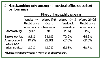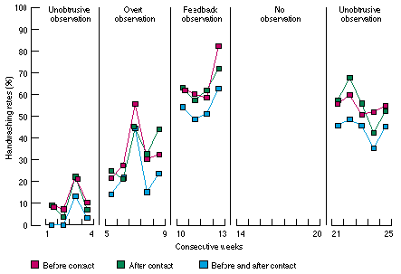 Interventions: A five-phase behaviour modification program: (i) unobtrusive observation for four weeks to obtain a baseline handwashing rate; (ii) overt observation for five weeks (preceded by written advice); (iii) overt observation continued for four weeks with performance feedback; (iv) all observation and feedback discontinued for seven weeks; and (v) unobtrusive observation for five weeks to obtain a residual rate.