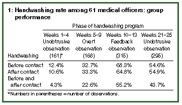In the first phase of this study, I found the handwashing rate among medical staff to be lower than rates reported previously (13%-28%,5 21%6 and 15%7). Physicians were observed unobtrusively as it is known that observation alone may alter behaviour, a phenomenon otherwise known as the "Hawthorne effect" (after the Hawthorne works of the Western Electric Company, where job performance was improved by the presence of observers).26 This effect was confirmed firstly by the abrupt increase in handwashing which accompanied notification of my intention to observe handwashing and again during the performance feedback phase.