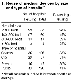 Methods: Questionnaires were sent to hospital infection control practitioners in 1994 requesting information about reuse in sterile sites of single-use medical devices, the extent of reuse, the cleaning and sterilising processes involved, and the reasons for reuse.