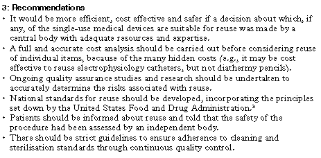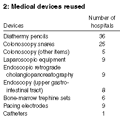 Abstract - Introduction - Methods - Questionnaire - Definitions of cleaning/sterilising - Examination of devices - Results - Discussion - Reuse of medical devices - Cleaning and sterilisation - Recommendations for reuse - Cross-infection - Costs and cost benefit - Acknowledgements - References - Author's Details