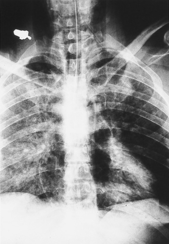 Figure 1: Postmortem erect chest x-ray, showing gas in both sides of the chest and in the neck veins (a combination of postmortem decompression, perimortem barotrauma and, possibly, decomposition).