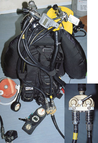 Examination of diving equipment Examination of the subject's diving equipment (Figure 2) re-vealed that he had been breathing the 50% oxygen/nitrogen mixture for most of the dive. Each tank had a separate first stage connected in an unusual fashion by a two-way switch, which the diver had had made by a local engineering shop. This allowed the diver to switch from one tank to another rapidly. This switch supplied a single second-stage mouthpiece. The two tanks were different colours; the circuit from the black (compressed-air) tank was marked with yellow tape, while the circuit from the yellow (nitrox) tank was unmarked.