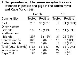 A total of 1242 human serum samples were collected from the other communities. Twenty people from three other outer islands had serological evidence of recent JE virus infection. There was no evidence of JE infection in those tested from the inner islands or from the Cape York communities (Box 3). There was no evidence of any prior infection (i.e., only IgG JE antibodies) in any individual.