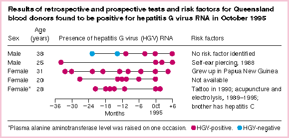 Outcome measures: Presence of HGV RNA by reverse transcription polymerase chain reaction (RT-PCR) in currently donated blood and in blood samples archived for up to 34 months. RT-PCR used two different reverse transcription methods and three different specific sets of primers and probes.