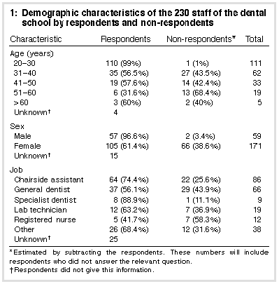 Participants: 230 staff members of the Westmead Dental School (consisting of general and specialist dentists, chairside assistants and registered nurses, laboratory technicians, dental therapists and hygienists) received questionnaires.