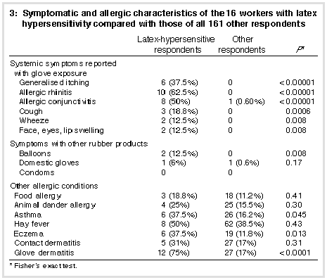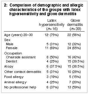 Table 2 (above) compares selected demographic and allergic characteristics of the 39 subjects (22%) who satisfied the criteria for glove dermatitis with the 16 subjects (9%) fulfilling the criteria set for latex hypersensitivity. Other symptomatic and allergic characteristics of the 16 dental workers with latex hypersensitivity are compared with those of the rest of the respondents in Table 3 (below). Almost all of the individuals reporting latex-allergic symptoms also met the criteria for glove dermatitis. Nineteen per cent of the latex-allergic group reported food allergy, although none reported symptoms with foods such as avocado, banana, nuts or soy products, foods which have been described previously as cross-reacting with latex protein.