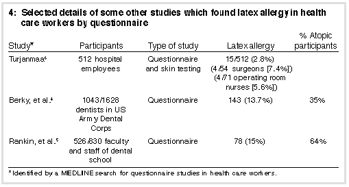 A number of studies4-6 have confirmed a relationship between atopy and latex allergy (Table 4). We also found a significant association when atopy was defined by our criteria (reported presence of any two of asthma, allergic rhinitis or atopic dermatitis).