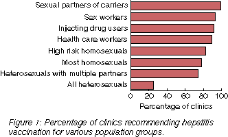 Gonorrhoea: Eighty-one clinics (99%) used culture, and 77 (94%) used Gram stain to diagnose gonorrhoea. The three most common treatments for gonorrhoea were amoxycillin plus probenecid, ciprofloxacin, and ceftriaxone, used in 63%, 24% and 12% of clinics, respectively (Box 3). New Zealand clinics were more likely than Australian clinics to use amoxycillin plus probenecid as first-line therapy for gonorrhoea (93% v. 49%; P = 0.01). Urban clinics in both Australia and New Zealand were more likely to use ciprofloxacin than rural and remote clinics (51% v. 21%; P = 0.02). Syphilis: Forty-seven clinics (57%) used dark-ground microscopy for diagnosing primary syphilis. For screening, 61 (74%) used the rapid plasma reagin (RPR) test, 58 (71%) the Treponema pallidum haemagglutination antibody (TPHA) test, and 25 (31%) the Ven ereal Disease Research Laboratory (VDRL) test. Fifty Australian clinics (91%), compared with 11 New Zealand clinics (41%), used the RPR test for screening (P < 0.001). The fluorescent treponemal antibody test (FTA) was used by 61 (75%) clinics to confirm the diagnosis. Procaine and benzathine penicillins were the first-choice treatments in all facilities. Chlamydia and non-gonococcal urethritis: Chlamydia was most commonly diagnosed by direct immuno fluorescence (DIF), which was used by 44 clinics (54%), followed by: enzyme immunoassay (EIA) from swabs, 39 clinics (48%); culture from swabs, 35 clinics (43%); and EIA from urine, 10 clinics (12%). Australian clinics were more likely to use culture to diagnose chlamydial infection than New Zealand clinics (58% v. 11%; P < 0.001), while New Zealand clinics were more likely to use DIF than Australian clinics (74% v. 44%; P = 0.01). Urban centres were significantly more likely to use culture to diagnose Chlamydia than rural and remote centres (58% v. 17%; P < 0.001). Most clinics used doxycycline as first-line treatment for Chlamydia and non-gonococcal urethritis (92% and 91%, respectively). Genital herpes: Herpes simplex virus (HSV) was diagnosed by viral culture (79 clinics [96%]), EIA (16 clinics [20%]), and serological testing (10 clinics [12%]). Acyclovir was used to treat primary HSV infections by 79 clinics (98%), for long term suppression by 70 clinics (86%), and for recurrences of HSV infection by 58 clinics (72%). Human immunodeficiency virus (HIV): All the clinics surveyed routinely offered counselling and voluntary HIV testing to all persons considered to be at risk of HIV infection. Fifty-two clinics (64%) had facilities to manage HIV- positive patients. Forty-one clinics (51%) provided antiretroviral therapy and prophylaxis and treatment of opportunistic infections. Genital warts: Cryotherapy was the first-line treatment for human papillomavirus infection in 55 clinics (69%), and podophyllin was the second most common treatment option, used in 17 clinics (21%). Australian clinics were more likely to use podophyllin than New Zealand clinics (16/53 [30%] v. 3/27 [11%]; P = 0.03). Trichomoniasis and bacterial vaginosis: To diagnose trichomoniasis, wet-film microscopy was the most common technique, used in 67 clinics (83%), while culture was used by 39 clinics (48%). Gram staining was the most common diagnostic technique for identifying bacterial vaginosis (74 clinics [93%]). Alternative diagnostic techniques used included culture to identify Gardnerella vaginalis and other anaerobes (56 clinics [70%]), vaginal pH testing (44 clinics [55%]), and the potassium hydroxide test (which identifies volatile amines) (41 clinics [51%]). Most clinics used metronidazole to treat trichomoniasis (53/80 [66%]) and bacterial vaginosis (50/79 [63%]). Viral hepatitis: Forty-four clinics (55%) offered antibody testing for hepatitis A and 79 (98%) for hepatitis C. Australian clinics were significantly more likely to offer antibody testing for hepatitis A than New Zealand clinics (36/54 [67%] v. 8/26 [31%]; P = 0.003). When screening for hepatitis B infection, 65 clinics (81%) meas ured surface antigen (HBsAg), 57 (71%) measured core antibody (HBcAb), and 48 (60%) measured surface antibody (HBsAb). Figure 1 shows clinic policies for hepatitis B vaccination. Vaccination was recommended for health care workers by 52/53 (98%) Australian clinics, compared with 19/27 clinics (70%) in New Zealand (P < 0.001); for heterosexuals with multiple partners, these figures were 44/53 (83%) and 15/27 (56%), respectively (P = 0.01); and for intravenous drug users (IVDUs), 52/53 (98%) and 21/27 (78%), respectively (P = 0.002). |