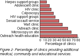 A questionnaire and prepaid addressed envelope were posted to the director (senior doctor or nurse) of each clinic. The 65-item questionnaire sought information about the geographic location and physical structure of clinics, as well as staffing, diagnosis, treatment and contact tracing for the various STDs, specialist medical services, and community and educational programs run by the facility. Non-respondents were sent a second questionnaire two months after the first. |