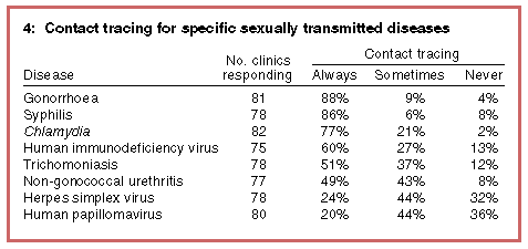 Results | We identified 101 STD facilities, one of which had closed down. From the remaining 100 clinics, 83 questionnaires were returned (72 on the first mailout and an additional 11 on the second). |