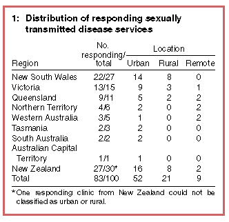 Geographic distribution | Fifty-six clinics were in Australia and 27 were in New Zealand. Sixty-three per cent were in inner-city and suburban areas, 26% in rural areas and 11% in remote areas (Box 1). Seventy-nine clinics (95%) were public and four (5%) were private.There were 71 STD clinics and five FPCs. One private facility identified itself as a specialist venereology practice, and three as general practices specialising in STDs and HIV. The remaining three clinics identified themselves as "other". Seventy-nine clinics (95%) were open to both men and women. |