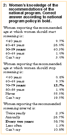 Results: The adjusted response rate was 64%. Almost 90% of women had heard of the national program; only 1% correctly stated that screening is for asymptomatic women. 60% correctly identified the current recommended age of starting screening is about 50 years of age; 26% thought screening should begin at about 40 years of age. Approximately 60% correctly reported that the recommended screening interval is every two years; 27% thought screening should be done annually. 55% reported ever having had a mammogram, and 37% reported having had at least one screening mammogram. Among women in the target age group (50-69 years) about 70% reported ever having had a screening mammogram, and about 50% reported having had a screening mammogram within the national program in the last two years. Among women aged 40-49 years, 29% reported ever having had a screening mammogram, and 22% reported having been screened in the last two years.
