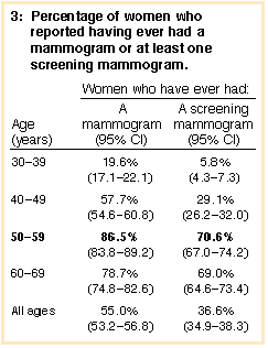 A series of questions was used to determine whether women had had a mammogram within or outside the national program. To determine whether it had been a screening mammogram, they were then asked, When you had [that mammogram] was it because you already thought you had some problems with your breasts?. Overall, 55.0% of all women reported ever having had a mammogram (Box 3). The frequency of having had a mammogram rose steeply with age, peaking in the 50-59 years age group at 86.5%. Overall, 36.6% of women reported having had at least one screening mammogram (Box 3). Among women aged 30-39 years, approximately 6% reported having been screened, and this proportion rose to approximately 70% in the 50-69 years target age group. Having had a screening mammogram was not associated with area of residence or with education.