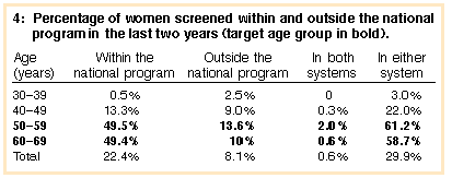 Recent meta-analyses showing a small reduction in mortality after about 10 years of screening for women aged 40-49 years13 have prompted heated debate over whether younger women should also be targeted for screening. It is interesting to note that we found quite high screening rates among women aged 40-49 years, indicating that many women in this age group are, in fact, already being screened.