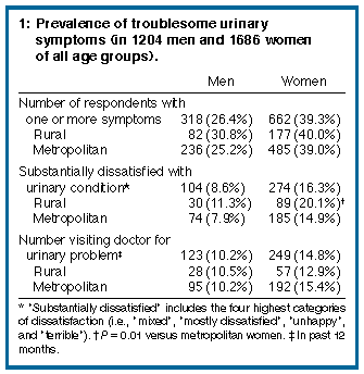 the community. Design: Interview-based prevalence survey. Setting: Metropolitan and rural communities in South Australia, September, 1995. Subjects: Probability sample of 1204 men and 1686 women (aged over 18 years) weighted to reflect the age and sex distribution of the South Australian population. Data collected: Presence of storage (irritative) and voiding (obstructive) symptoms, based on the International Prostate Symptom Score questionnaire; satisfaction with urinary condition (quality-of-life measure); and visits to a doctor for urinary symptoms in the preceding 12 months. Results: The prevalence of one or more troublesome LUTS was 26% (318/1204) for men and 39% (662/1686) for women (all ages) and 48% (314/649) for men and women over 65. The most common troublesome symptoms in men and women were nocturia and frequency. Symptoms were significantly age-related in men, but less so in women, in whom symptom prevalence exceeded 30% for all age groups. Ten per cent of men (123/1204) and 15% of women (249/1686) had visited a doctor for a urinary problem in the previous 12 months. Nine per cent of men (104/1204) and 16% of women (274/1686) were substantially dissatisfied with their urinary condition. Symptom prevalence and dissatisfaction with urinary condition were significantly associated with visiting the doctor ( P < 0.0001), but only 28% (88/318) of men and 27% (179/662) of women with troublesome LUTS saw a doctor, and 63% (65/104) of men and 59% (162/274) of women dissatisfied with their urinary condition did not seek medical help. Conclusions: Although the prevalence of troublesome LUTS in the community is high, the number of people whose quality of life is substantially affected is much lower. The impact of these symptoms upon quality of life is a major reason for patients to see a doctor, yet many who are "bothered" by the symptoms do not do so. |