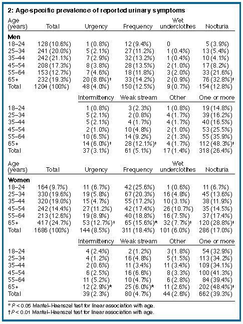 The most common symptoms in both men and women were frequency and nocturia (Box 2). In men, nocturia increased significantly with age (from 4% in 18- to 24-year-olds to 33% in those over 65 years; P < 0.00001). Weak stream also increased, from 2% in 18- to 24-year-olds to 12% in men over 65 (P < 0.00001).