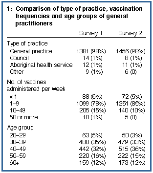 Response rates | After exclusion of respondents who indicated they did not provide childhood vaccinations, response rates were 77% for Survey 1 and 78% for Survey 2. Ninety-eight per cent of respondents worked in general practice. The two samples did not differ significantly in type of practice or age groups, but, for number of vaccines given per week, significantly more respondents in Survey 2 gave between one and nine (Box 1, below). |