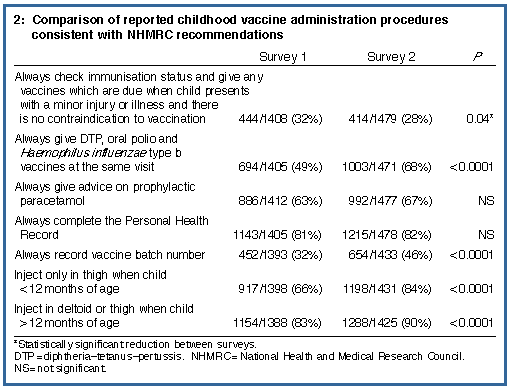 of the National Childhood Immunisation Program. Design: Two cross-sectional self-completion mail surveys of Australian GPs, in October/November 1994 (Survey 1) and April/May 1996 (Survey 2). Participants: 1417 systematically selected (Survey 1) and 1482 randomly selected (Survey 2) GPs. Intervention: Mailing of a package of publications on immunisation to all GPs, a community education campaign, and the introduction of the Australian Childhood Immunisation Register. State and Territory and local initiatives on immunisation, changes in vaccine distribution and funding, and media coverage of vaccination issues may also have affected GPs' procedures. Main outcome measures: Reported vaccination procedures consistent with National Health and Medical Research Council (NHMRC) recommendations. Results: Response rates were 77% (Survey 1) and 78% (Survey 2). There were statistically significant rises in the proportions of GPs who reported vaccination procedures consistent with NHMRC recommendations for simultaneous administration of vaccines, injection site, vaccination of children taking antibiotics or those with mild upper respiratory tract infection, and vaccine storage. There was a reduction in reported opportunistic vaccination, and no change in reported procedures regarding pertussis vaccination. Conclusions: Many factors may have contributed to these changes in GP vaccination procedures. While the changes mostly show an improvement in adherence to NHMRC guidelines, further progress needs to be made, particularly in the areas of opportunistic vaccination, pertussis vaccination and vaccine storage. The best method of informing GPs of current vaccination recommendations needs to be explored. |
