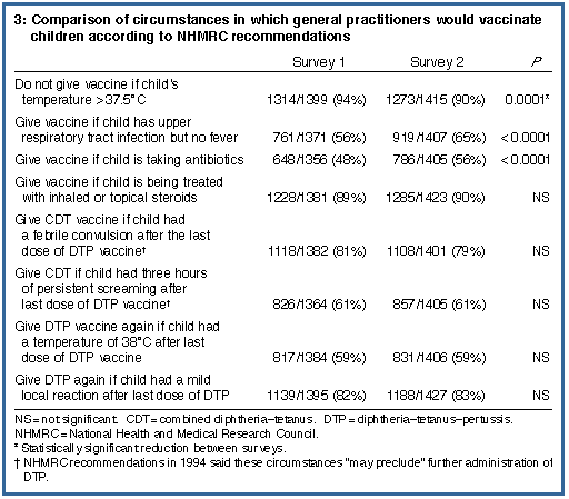There were statistically significant rises from 1994 to 1996 in reported willingness of GPs to vaccinate children with mild upper respiratory tract infections or who were taking antibiotics (Box 3), and there was a fall from 94% to 90% in the proportion of GPs who would not vaccinate a febrile child. There was no change between the two surveys regarding when CDT should be used to replace DTP, or vaccination for a child taking inhaled or topical steroids.