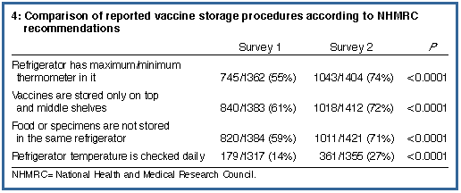 sampling method was used for random selection for Survey 2.10 Both surveys were anonymous self-completion mail surveys. For each survey, an initial questionnaire and covering letter was sent to each GP, followed a week later by a reminder letter and a duplicate questionnaire. Practitioners were asked to ignore the reminder if they had already completed the questionnaire, and to return only one blank questionnaire if they did not wish to participate in the survey. The two surveys contained identical questions about GPs and their practices, vaccine storage methods and vaccination procedures. Questions on vaccination procedures and vaccine refrigeration were based on the NHMRC recommendations in the fifth edition of The Australian immunisation procedures handbook (1994). No identifying information was collected. |
