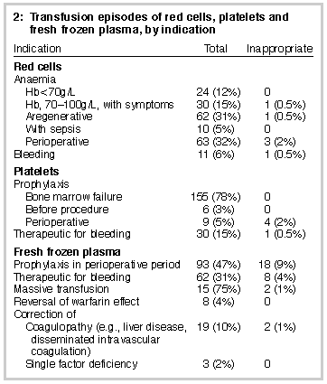 Analysis of outcomes | For each type of blood product (red cells, platelets and FFP), we analysed 200 consecutive transfusion episodes between March and May 1996. As in the initial audit, we excluded FFP transfusions for patients with thrombotic thrombocytopenic purpura, because of the different rationales for FFP use in this condition and in coagulation factor depletion. Rates of inappropriate blood product use after introduction of prospective monitoring were compared with those found during the previous audit (pre-intervention) with two-sided Fisher's exact tests. |