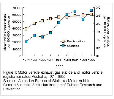 In 1995, suicide by motor vehicle exhaust gas accounted for 509 deaths and was second only to hanging. It was most commonly used by males (85%), especially those aged 20-50 years. Rates of motor vehicle exhaust gas suicide per 100 000 population in Australia were 4.69 for males, 1.02 for females and 2.85 total (Australian Institute for Suicide Research and Prevention, 1996; unpublished data). Further, motor vehicle exhaust gas related self-harm represented a smaller proportion of patients hospitalised for attempted suicide than of successful suicides (2.0% v. 21.6%; Australian Institute of Health and Welfare, National Injury Surveillance Unit, 1996; unpublished data), indicating the high lethality of this means of suicide. Motor vehicle availability has been found to be related to exhaust gas suicides,1 and in Australia the rates of such suicides in different States vary to some extent with motor vehicle registration rates. For example, the Northern Territory has the lowest rates for each, while Western Australia has relatively high rates (Australian Institute of Health and Welfare, National Injury Surveillance Unit, 1996; unpublished data).2 Carbon monoxide (CO), the most toxic component of motor vehicle exhaust gas, is colourless, odourless and tasteless and is produced from the incomplete combustion of organic fuels. Mild CO poisoning produces headache and drowsiness; more severe poisoning leads to collapse, coma and death.3 Other effects can include myocardial infarction, deterioration of personality and impaired memory.4,5 Environmental regulations have required carbon monoxide emission levels from vehicle exhausts to be reduced over past decades. The required maximum levels have been 24.3 g/km from July 1976 (Australian Design Rule [ADR] 27A), 9.3 g/km from 1986 for new passenger vehicles (ADR 37-00) and 2.1 g/km for new models (ADR 37-01) from 1997 and for all new passenger vehicles from 1998. To cope with the unleaded petrol legally required since 1986 to reduce environmental air pollution from exhaust emissions, vehicles usually require catalytic converters (ADR 37-00; Australian Standard 2877). These convert carbon monoxide and other pollutants into the by- products, carbon dioxide and water. The purposes of this study were to examine overall trends in exhaust gas suicides, and to investigate the impact of the 1986 reduction in allowable carbon monoxide emissions (or the effects of catalytic converters) on that suicide rate. |
