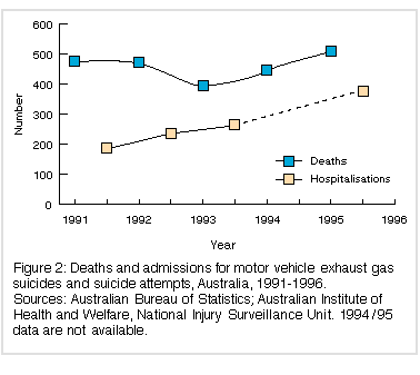 Hospital admissions for Australian motor vehicle exhaust gas suicide attempts have increased steadily in recent years (1994/95 data are not available), with the data showing an exponential trend (R2 = 0.99). Deaths also increased, but show no clear trend (Figure 2).