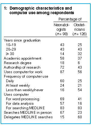 Respondents were then asked about their access to and use of computers, and asked directly whether they had heard of, had access to, and used the Cochrane database, Oxford database, and Effective care of the newborn infant (neonatologists) or Effective care in pregnancy and childbirth (obstetricians). Those who reported using any of these resources were asked what a systematic review was, how often they consulted that resource, what they used it for, whether they thought using it had made any difference to their clinical practice and, if so, whether they could name a treatment policy they had altered in response to evidence from a systematic review. To count as users of systematic reviews, respondents had to mention randomised trials or meta-analysis in their description of a systematic review. The final questions sought demographic information on clinical experience, place of education, attendance at professional meetings, research publications, academic appointments, and qualifications. A research degree was defined as a doctorate, relevant master's degree, or bachelor's degree of science in medicine, held in addition to basic medical and specialty qualifications. Reports of authorship were verified by searching MEDLINE and by screening abstracts. For neonatologists it was noted whether they held full- or part-time positions, whether they worked in a hospital with an obstetric unit, whether they headed a neonatal unit, and in which unit they worked. For obstetricians, it was noted whether they held a position as a full-time staff specialist in a public hospital. They were asked how many deliveries they attended each year, and whether they worked at any hospital with an accredited RACOG training post. The interview schedule was modified after a pilot study with seven neonatologists in New Zealand. The main survey was conducted between August and December 1995, with ethics approval from the ANZNN, RACOG and the University of Sydney. All interviews were conducted by the first author (C F C J). |