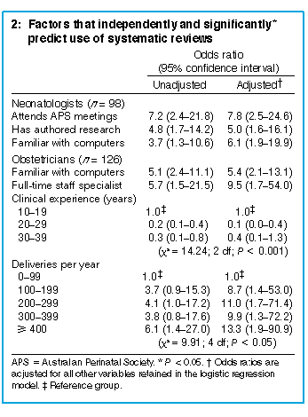 ![]() Among obstetricians, four factors sig nificantly and independently predicted use of systematic reviews: familiarity with computers, mode of practice (full-time staff specialists were more likely to use systematic reviews than others), clinical experience (recent graduates were more likely to use systematic reviews), and number of deliveries per year (likelihood of using systematic reviews increased with this number). |