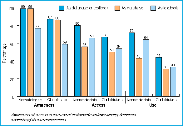 For the purpose of keeping up with new clinical developments, respondents favoured journals, conferences and meetings, colleagues and MEDLINE (in that order) over systematic reviews. For the purpose of clinical problem-solving, colleagues, MEDLINE, journals, and other printed medical literature were favoured over systematic reviews as sources of information. Although the percentages favouring each source varied between the two specialties and according to whether the respondent was simply nominating the resource or nominating it as the most important resource, the rank order of the resources remained consistent. In each specialty, 21% of respondents mentioned systematic reviews without prompting from the interviewer when naming the information sources they used, or when describing their computer use. When questioned directly about systematic reviews, 71 neonatologists (72%) and 55 obstetricians (44%; 95% confidence interval, 36%-51%) reported using them in either electronic database or textbook form. The confidence interval indicates the reliability of the sample prevalence as an estimate of the population prevalence. The Figure shows reported levels of awareness of, access to and use of systematic reviews by specialty. |