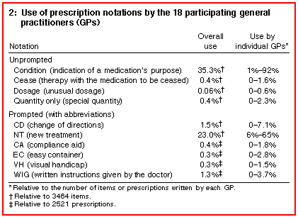 Data analysis | For frequency analysis of the questionnaires and of the prescription data, we used, respectively, the statistical package Genstat8 and the computer database program Access.9 Transcripts of interview data and focus group discussions were coded according to emerging themes around the prescription format and particular notations. The analysis, with the NUDIST program for qualitative analysis,10 concentrated on direct testimonies of views held about the new prescription form. |
