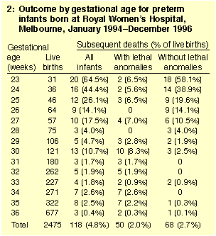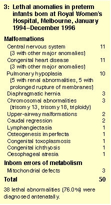 Sixty-eight infants died who were without lethal anomalies: 2.8% of the 2425 livebirths, but only 0.2% of infants of 32-36 weeks' gestational age (4/1759) (Box 4). Sixty-one died within 28 days of birth and seven (10.3%) died later during the primary hospitalisation. In the Australian and New Zealand Neonatal Network, 35 of 256 deaths (13.7%) of infants of less than 32 weeks' gestational age without lethal anomalies died during the primary hospitalisation but after 28 days of age.10