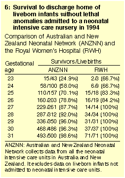 The survival rate to hospital discharge in 1994 for infants free of lethal malformations cared for in neonatal nurseries at 23-31 weeks' gestational age was higher in our hospital than in reported data from the Australian and New Zealand Neonatal Network (Box 6).
