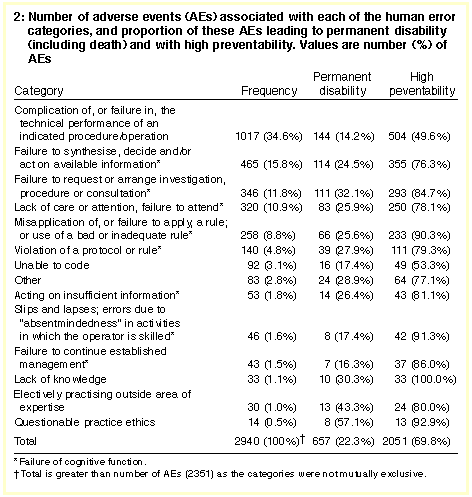 Fifty per cent of the AEs in the QAHCS were judged to have a high preventability score (4 or more on a scale of 1-6 of increasing likelihood of preventability).1 The disability caused by these adverse events ranged from temporary disability (fully resolved in one month) in 46.6% of AEs, to death in 4.9% of AEs. Although recording AEs emphasises only the "complications" of rather than the benefits derived from healthcare, AEs are of great significance to individual patients as well as to the whole healthcare system. |
