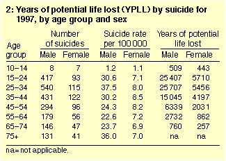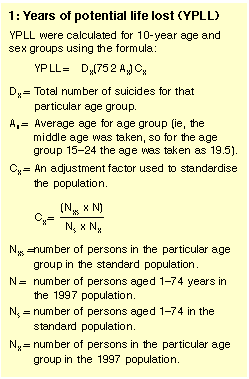 Years of potential life lost by suicide in 1997 are shown in Box 2.