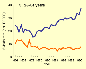 The rise in suicide rates from 1973-1997 for men aged 25-34 years was