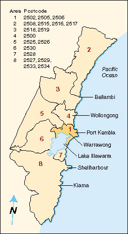 Figure 1 (above): Map of the Illawarra region, showing areas used for comparing leukamia incidence.