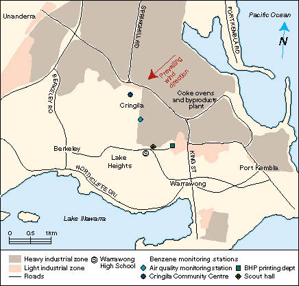 Established causes of leukaemia include occupational benzene exposure, ionising radiation, chemotherapeutic agents, and some inherited and congenital conditions.1-5 Coke byproduct plants are a recognised source of occupational, and potentially of environmental, benzene exposures.1,6,7 The people in the cluster lived in suburbs adjacent to the Port Kembla industrial complex, which includes coke ovens and an associated byproducts plant.