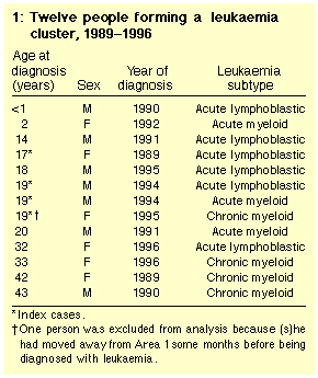 Of the nine people from Area 1 aged 20 years or less, seven had lived there all their lives, and two for about 11 years. Four attended the same high school in the late 1980s, with three being in the same school year; these three people had leukaemia of different cell-types.