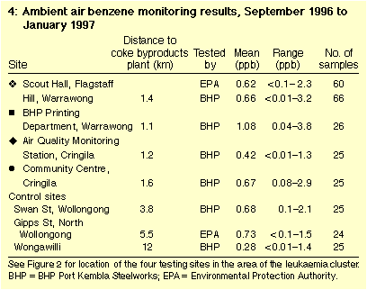 Both EPA and BHP monitoring found that ambient air benzene concentrations in Area 1 averaged less than one part per billion (ppb) in 1996 (Table 4), typical of urban sites in Sydney.19 Analysis of benzene, toluene and xylene ratios in the EPA's samples indicated that about 50% of the benzene was from petroleum.