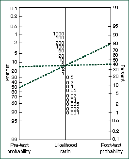 Normogram for applying likelihood ratios, adapted from Fagan.8 Lines show post-test probabilities when LR = 4.0 and pre-test probabilities are 15% and 50%, respectively.