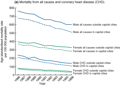 outside Australian capital city statistical divisions. Design and setting: Descriptive epidemiological study based on data for all residents of Australia aged 30-69 years who died between 1986 and 1996 in all States and Territories of Australia. Main outcome measures: Standardised mortality rates from all causes and coronary heart disease as coded by the Australian Bureau of Statistics, and estimated excess deaths in populations living outside capital city statistical divisions. Results: Between 1986 and 1996, mortality from CHD declined by 46% in men and 51% in women, and accounted for 61% of the decline in mortality from all causes in men and 48% in women. More deaths than expected from acute myocardial infarction resulted in mortality rates from CHD up to 30% higher in men and 21% higher in women living outside the capital city statistical divisions, and accounted for an overall estimated excess of 3835 deaths from CHD in men (32% of excess deaths from all causes), and 1385 deaths from CHD in women (27% of excess deaths from all causes) over the 11-year study period. Conclusions: Although there were impressive declines in coronary mortality in all Australian States and Territories from 1986 to 1996, populations living outside capital cities continue to have higher death rates from CHD. These differences in mortality rates indicate a need for further research into factors which may influence mortality rates for CHD in rural and remote areas, and immediate measures to ensure optimal treatment of coronary risk factors and acute coronary events in such populations. | |