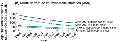 Between 1986 and 1996, mortality from CHD in Australian men aged 30-69 years declined by 46% and accounted for 61% of the decline in all-cause mortality. Mortality among men living within capital city statistical divisions declined by 49%, compared with 41% among men living outside capital city statistical divisions (Box 1). Mortality from CHD in populations outside the capital cities remained higher than in capital city populations, with the difference increasing from 13% in 1986 to 30% in 1996. Mortality from AMI among men living within capital city statistical divisions declined by 62%, compared with 50% among men living outside capital city statistical divisions (Box 1). Mortality from AMI in men living outside the capital cities remained higher than in capital city populations, with the difference increasing from 24% in 1986 to 63% in 1996. | ||