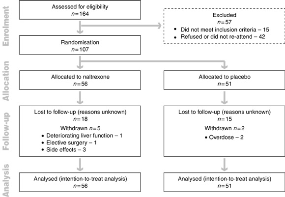 Regardless of treatment response, 67 patients (63%) attended treatment for 12 weeks: 33/56 (59%) taking naltrexone and 34/51 (67%) taking placebo. Subsequently, 30/67 patients (45%) chose to continue taking naltrexone for a further 3 months of treatment: 16 of those initially taking naltrexone and 14 of those given placebo.