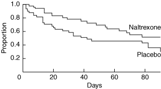 Results: On an intention-to-treat basis, the Kaplan–Meier survival curve showed a clear advantage in relapse rates for naltrexone over placebo (log-rank test, χ21 = 4.15; P = 0.042). This treatment effect was most marked in the first 6 weeks of the trial. The median time to relapse was 90 days for naltrexone, compared with 42 days for placebo. In absolute numbers, 19 of 56 patients (33.9%) taking naltrexone relapsed, compared with 27 of 51 patients (52.9%) taking placebo (P = 0.047). Naltrexone was well tolerated.