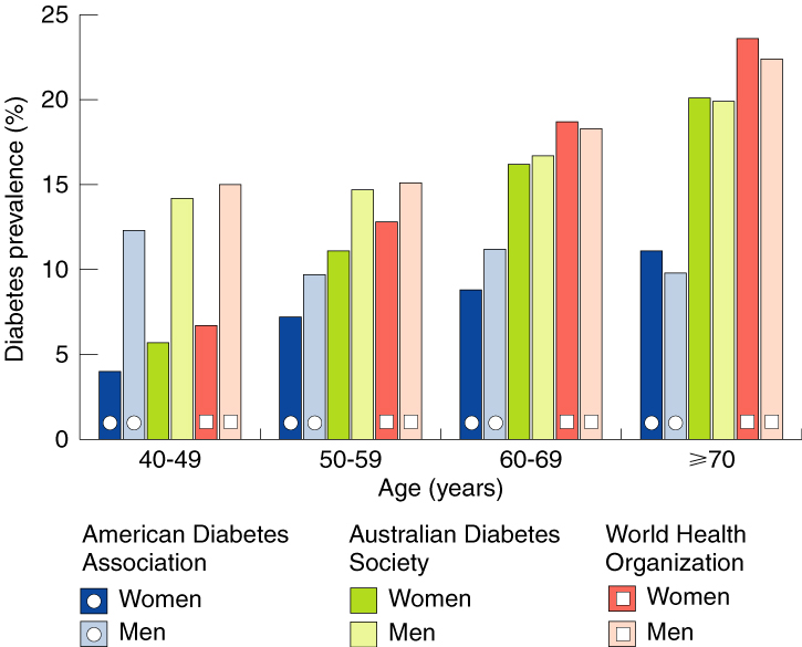 Prevalence of diabetes in this group using the three sets of diagnostic criteria is shown in Box 2, and differentiated by age and sex in Box 3. Overall prevalence increased with age using all three sets of criteria, as did prevalence in each sex, except in men using the American criteria. WHO criteria identified a greater proportion of people with diabetes than the other two sets of criteria in all age groups, particularly in the oldest group (≥70 years), and particularly compared with the American criteria.
